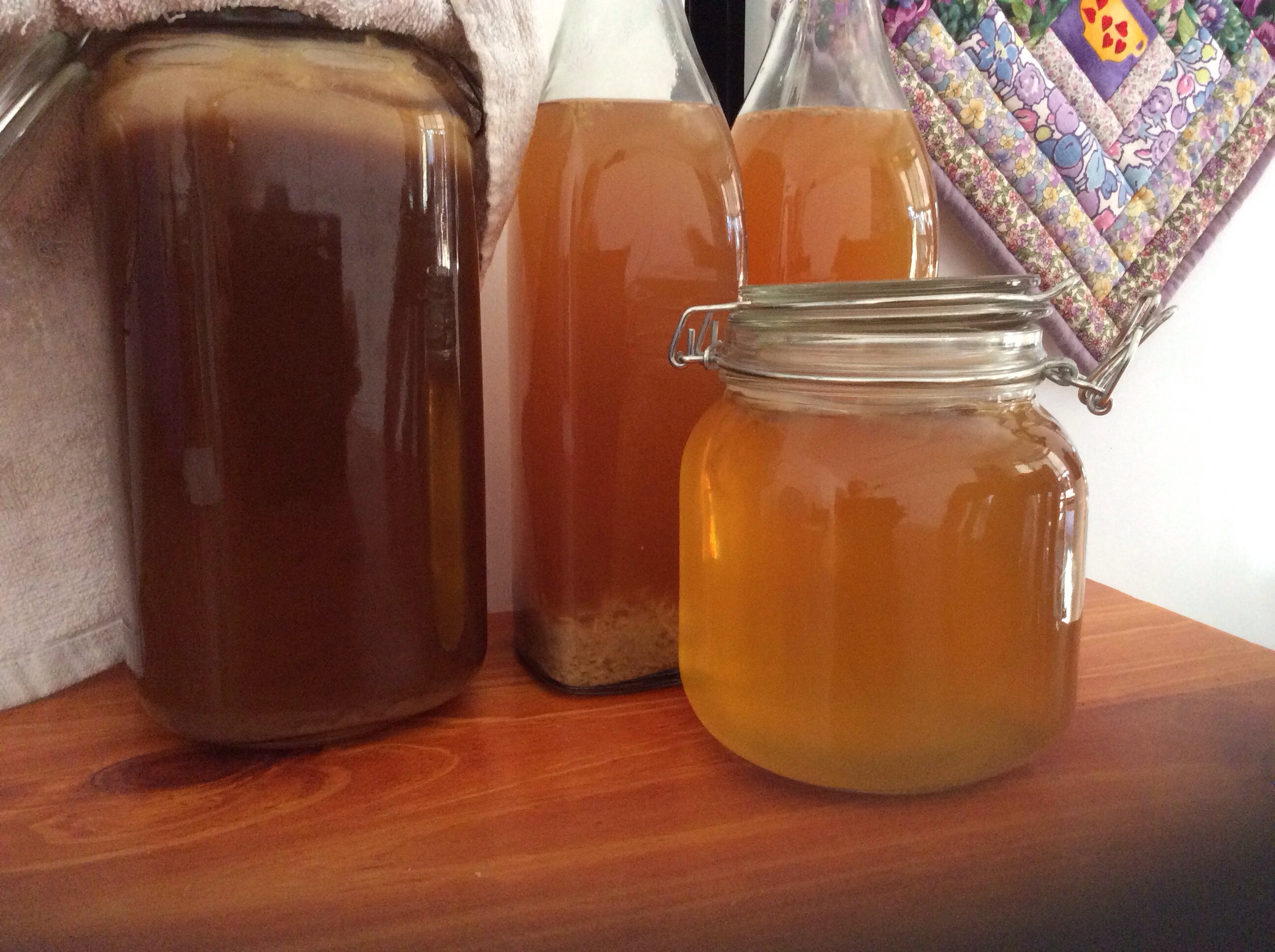What is it you ask? Well they are probiotic drinks that instead of using a dairy base and making yoghurt, you use water and with the Kombucha Green or Black Tea and organic sugar(I use Rapadura or Panella which is simply unprocessed dehydrated cane juice) the Kefir are little clear Jelly like grains that may or may not multiply and the Kombucha Scobie is like a flat smooth Mushroom that grows on top of the fermenting liquid like a skin that gets thicker….it sounds kind of gross but it’s actually very cool and they multiply with every batch. The cultures eat the sugar to make a sour soda pop that you can the flavour with fruit or ginger or vanilla etc and sweetened with your Stevia, I wouldn’t use sugar once in bottle apart from a tiny amount for fizz or the bottles could explode…