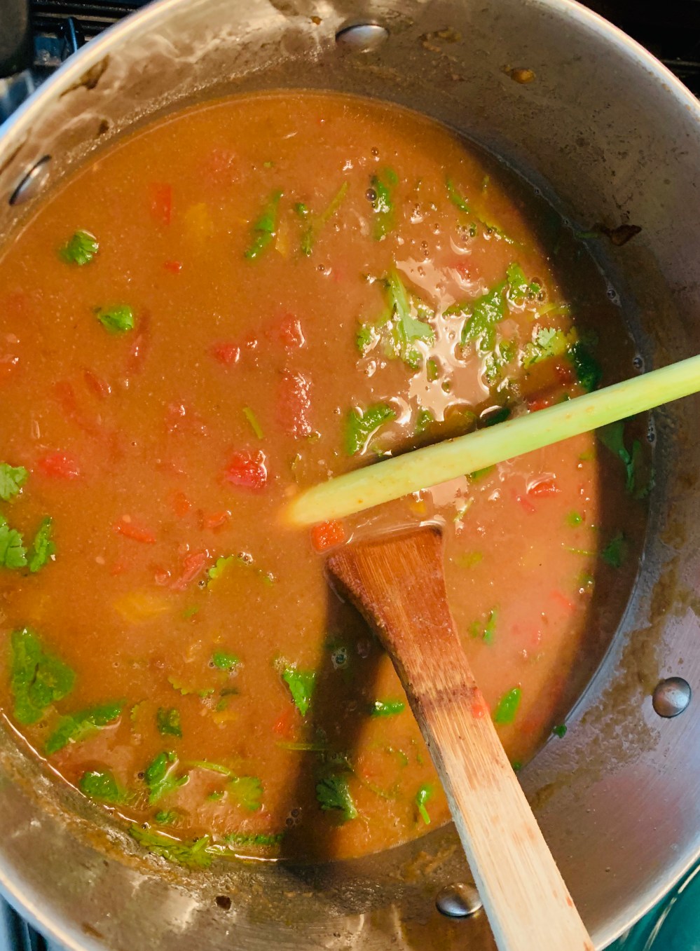 Add the other 2 Lime Leaves, bruised Lemon Grass Stalks and Capsicum to the pot and simmer till lentils are soft and then add the Tinned Tomatoes in and bring back to the boil for a minute or 2.